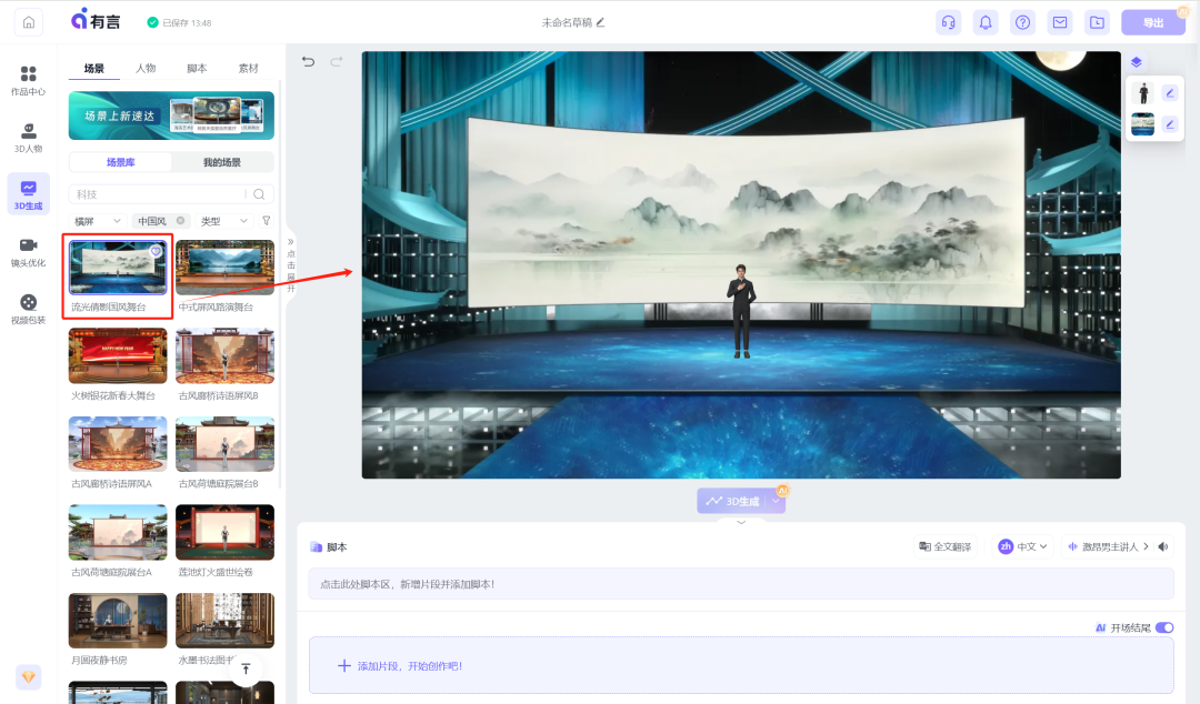 进入3D数字人视频创作界面,左侧编辑窗口默认显示【场景】-【场景库】界面,锅头在这里选择风格为“中国风”。