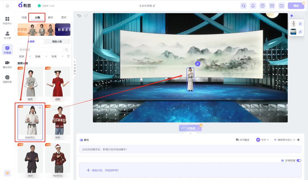 场景选定后,接下来锅头点击【人物】进入人物库窗口界面,选择“诗仙李白”,看到场景舞台中的人物变成了诗仙李白。