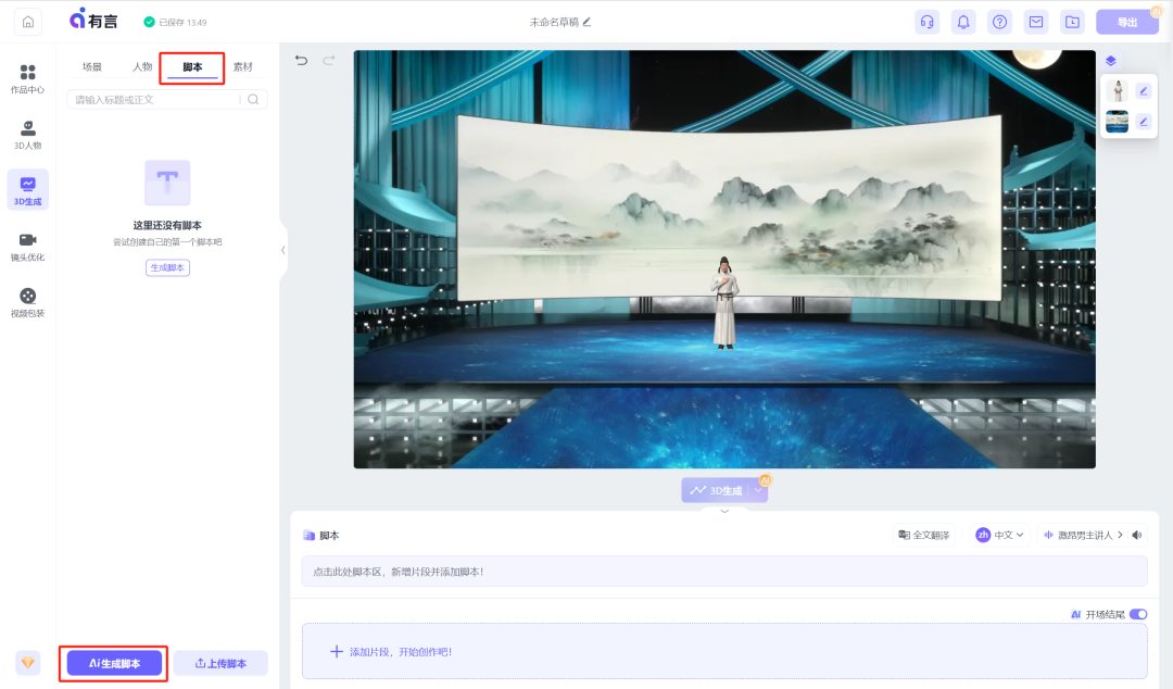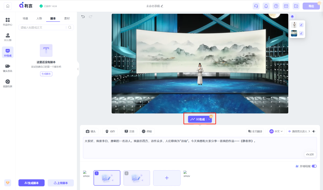应用脚本成功后,可以看到3D数字人视频编辑界面自动增加了视频片段和脚本内容。有言平台基于视频场景和时长,自动分成了2个视频片段和2段脚本。
