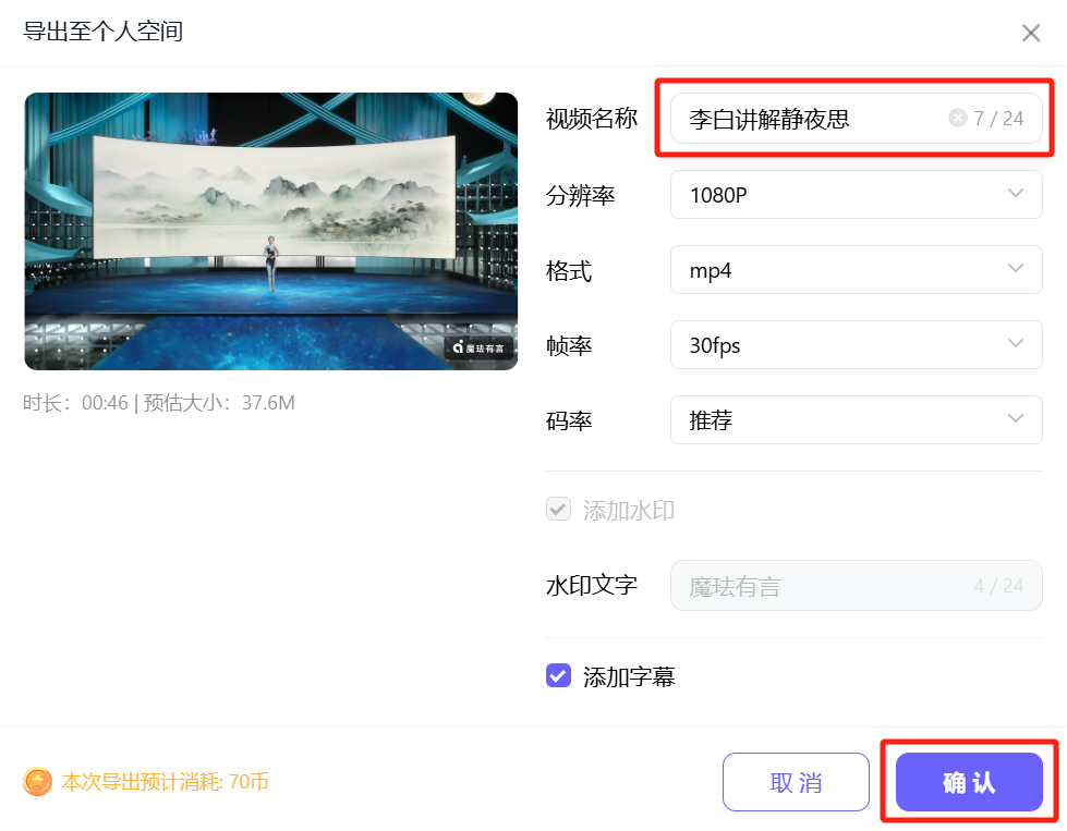 弹出导出窗口,输入视频名称,选择分辨率和视频格式后,点击【确认】。