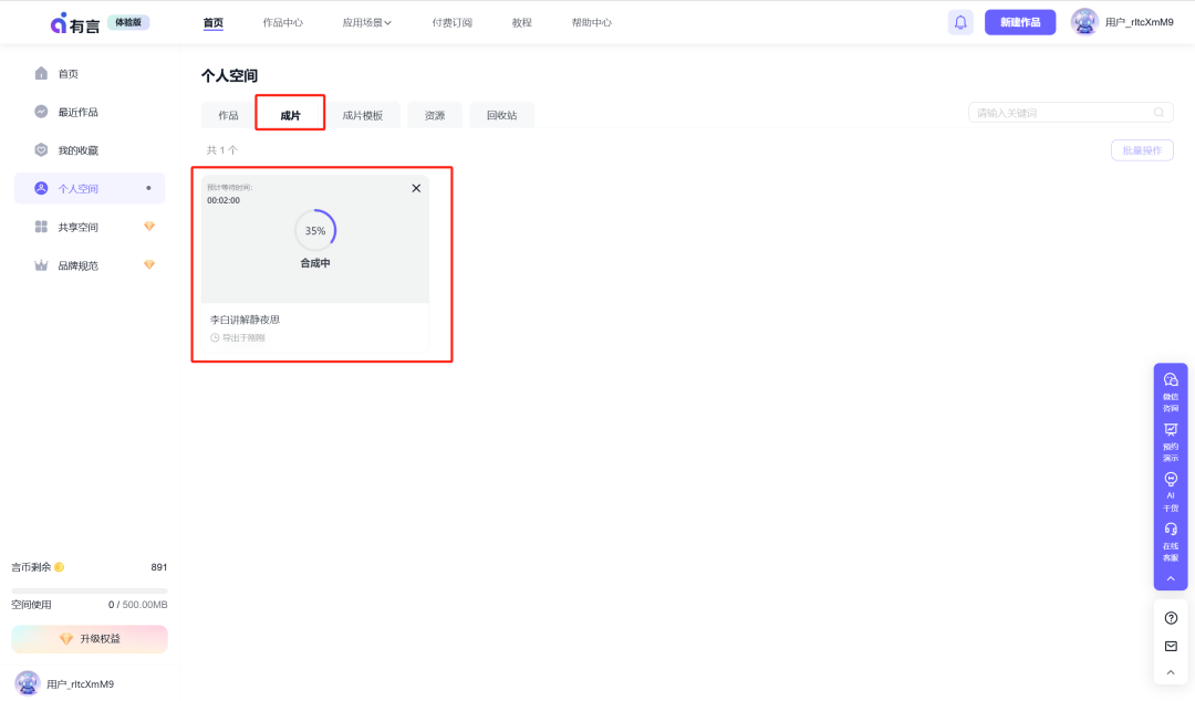 点击【确认后】,跳转至个人空间的成片界面,看到视频正在合成中。