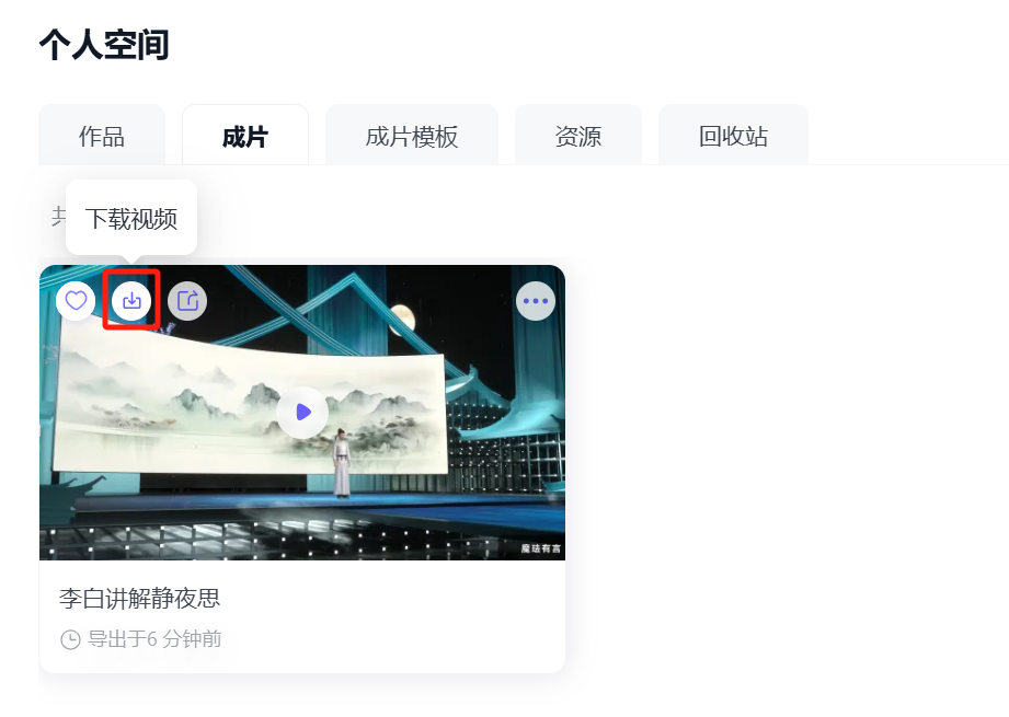 等待5分钟左右,咱们刚才创作的3D数字人视频合成成功,点击【下载视频图标】。